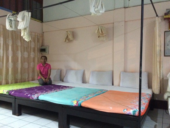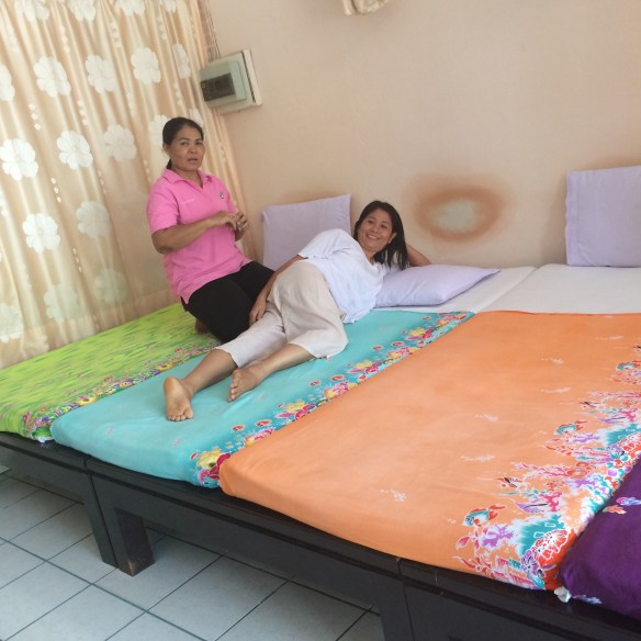 Parto da Mut Mee levando minhas amigas da cozinha para fazer massagem. Thia já tinha ganho de mim uma vez e fica muito feliz. Yong me abraça comovida. Noy nao diz nada. E Maan agradece mas me devolve porque ela nao gosta de massagem.